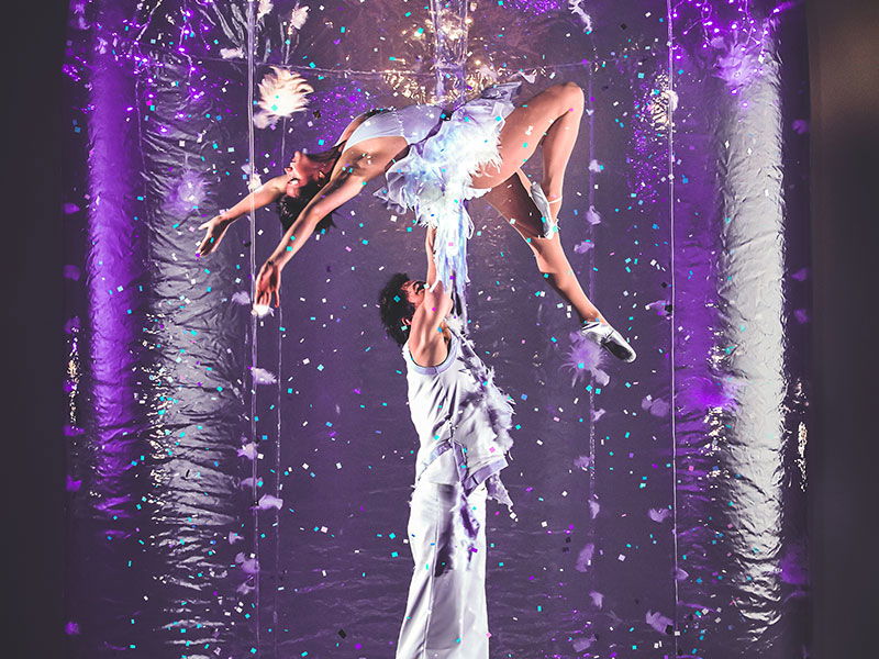 A unique and visually beautiful addition to any event, the Magical Snowdome will captivate any audience. Combining graceful acrobatics and amazing balancing displays, with glitter continuously falling over them, the Magical Snowdome is a striking act that your guests will not forget.