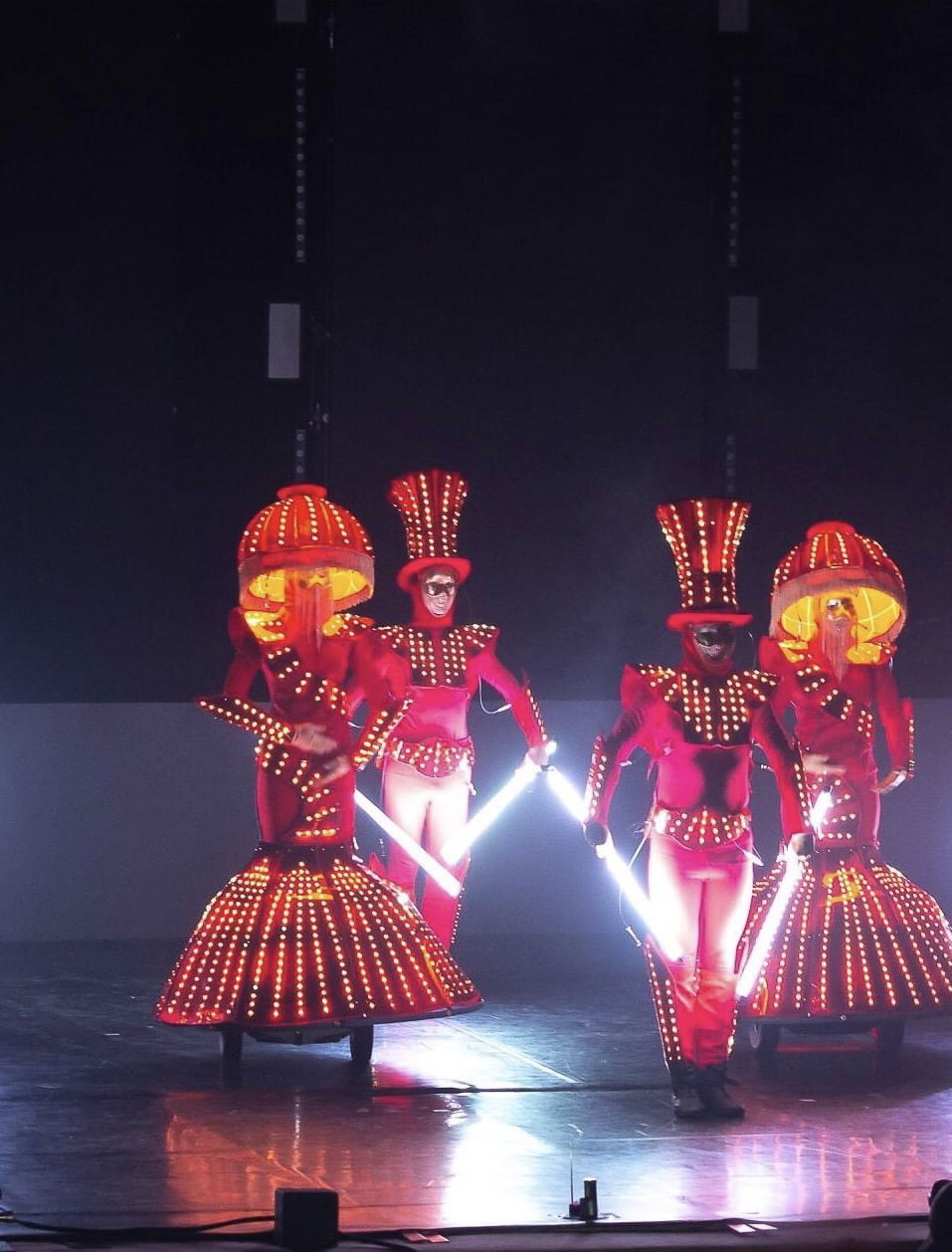 Enigmatic lamp figures, gracefully gliding across the stage, dancers adorned in opulent attire topped with lofty hats, an unforeseen burst of light, enchanting melodies - these distinctive elements coalesce to craft a mesmerizing performance that enthrals the audience completely.